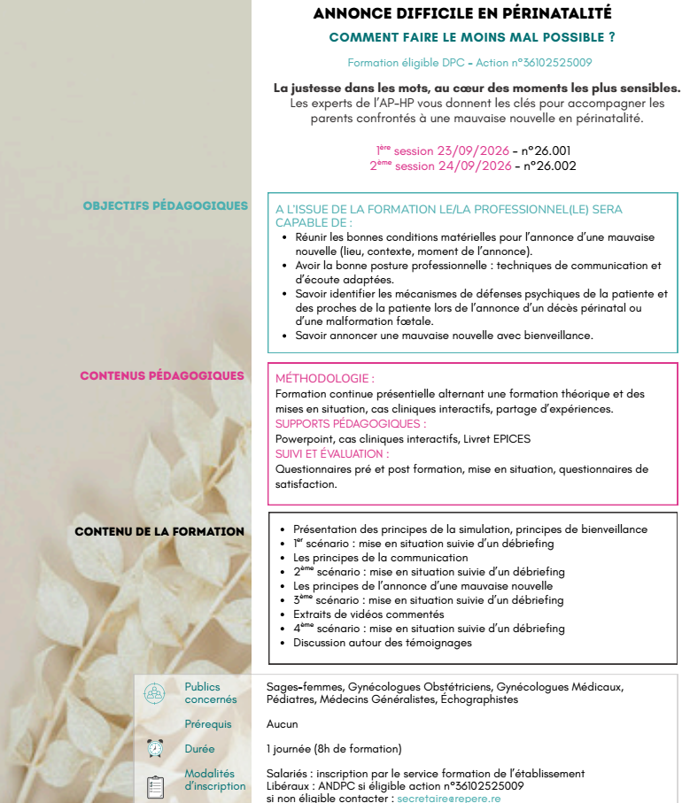2 sessions de formation sur l’annonce difficile en périnatalité : les 23 et 24 SEPTEMBRE 2026