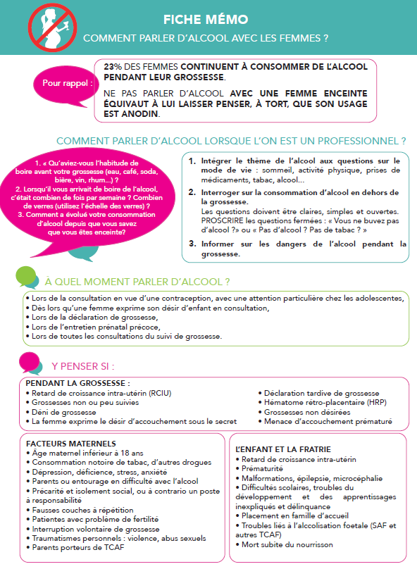 Addictions Prise en charge du tabac chez la femme enceinte Femme et alcool, parcours de soin femmes en âge de procréer Fiche mémo : Comment parler d’alcool avec les femmes ? Les structures d’accueil, d’accompagnement et de soins en addictologie