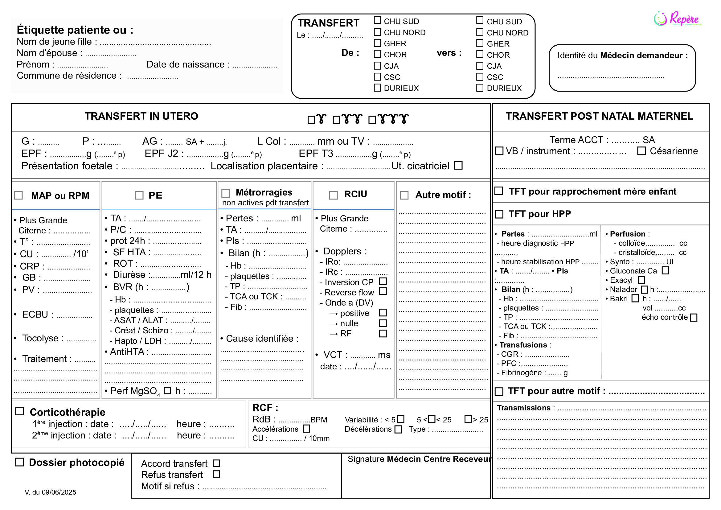 Transferts maternels Fiche fax de transfert in-utéro et post-natal Fiche de dysfonctionnement de transfert Procédure de transfert