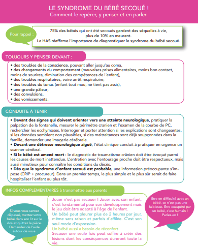 Syndrome du bébé secoué Le syndrome du bébé secoué, comment le repérer y penser et en parler ? Brochure de prévention “Mon bébé, je l’aime, je le protège !”