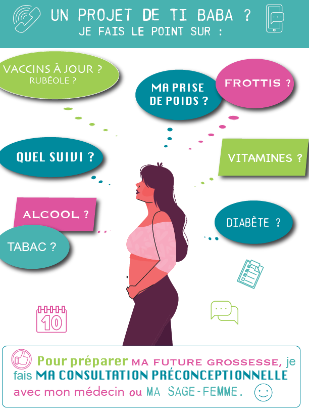 - Pour aborder les questions diverses que vous vous posez, en lien avec votre santé et celle de l’enfant à naître : hygiène alimentaire, équilibre diabétique, dépendances (alcool, tabac, zamal…), vaccination…